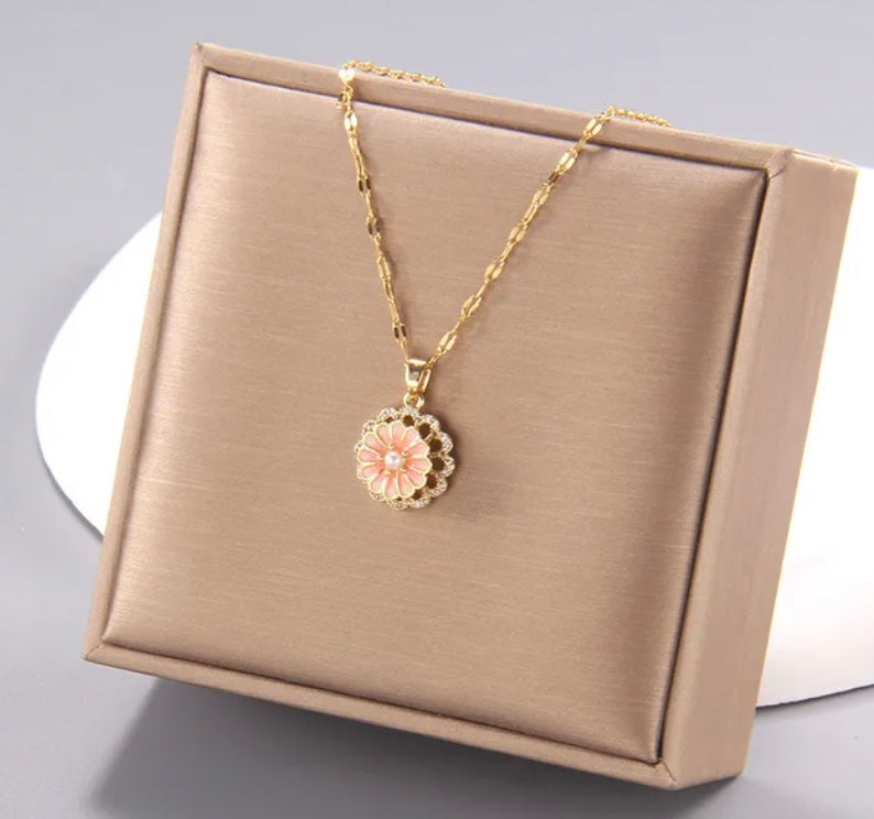 Stainless Steel Pearl Centre Pink Flower Rotating Necklace
